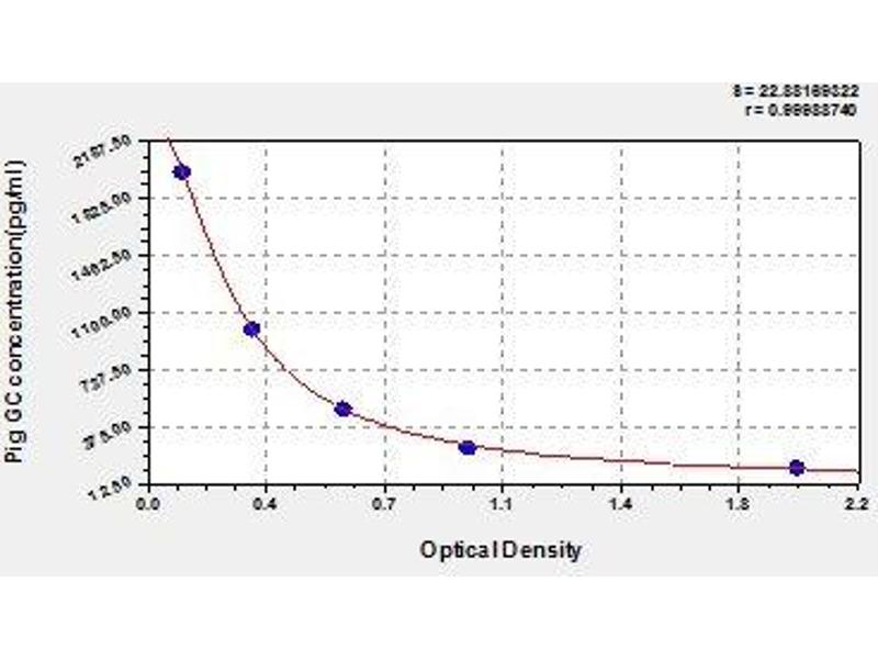 This assay employs the competitive inhibition enzyme immunoassay technique. The microtiter plate provided in this kit has been pre-coated with an antibody specific to GC. Standards or samples are added to the appropriate microtiter plate wells with Biotin-conjugated GC. A competitive inhibition reaction is launched between GC (Standards or samples) and Biotin-conjugated GC with the pre-coated antibody specific for GC. The more amount of GC in samples, the less antibody bound by Biotin-conjugated GC. After washing, avidin conjugated Horseradish Peroxidase (HRP) is added to the wells. Substrate solution is added to the wells and the color develops in opposite to the amount of GC in the sample. The color development is stopped and the intensity of the color is measured.
