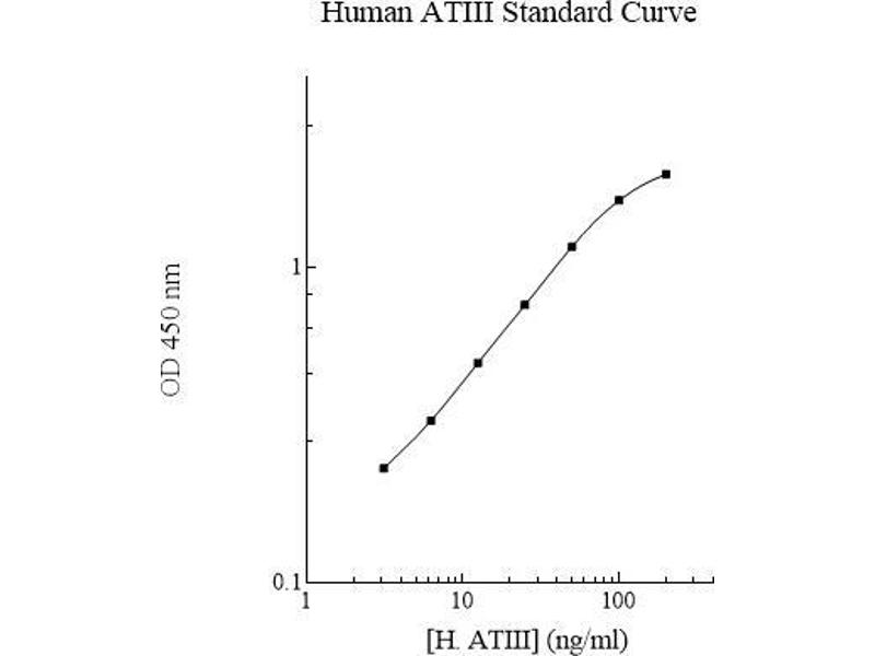 Prepare all reagents, standard solutions, and samples as instructed. Bring all reagents to room temperature before use. The assay is performed at room temperature (20-25 °C). Remove excess microplate strips from the plate frame and return them immediately to the foil pouch with desiccants inside. Reseal the pouch securely to minimize exposure to water vapor and store in a vacuum desiccator. Add 50 l of Human Antithrombin III Standard or sample to each well. Gently tap plate to thoroughly coat the wells. Break any bubbles that may have formed. Cover wells with a sealing tape and incubate for 2 hours. Start the timer after the last addition. Wash five times with 200 l of Wash Buffer manually. Invert the plate each time and decant the contents, hit 4-5 times on absorbent material to completely remove the liquid. If using a machine, wash six times with 300 l of Wash Buffer and then invert the plate, decanting the contents, hit 4-5 times on absorbent material to completely remove the liquid. Add 50 l of Biotinylated Human Antithrombin III Antibody to each well. Gently tap plate to thoroughly coat the wells. Break any bubbles that may have formed. Cover wells with a sealing tape and incubate for 1 hour. Wash the microplate as described above. Add 50 l of Streptavidin-Peroxidase Conjugate to each well. Gently tap plate to thoroughly coat the wells. Break any bubbles that may have formed. Cover wells with a sealing tape and incubate for 30 minutes. Turn on the microplate reader and set up the program in advance. Wash the microplate as described above. Add 50 l of Chromogen Substrate to each well. Gently tap plate to thoroughly coat the wells. Break any bubbles that may have formed. Incubate for 12 minutes or until the optimal blue color density develops. Add 50 l of Stop Solution to each well. The color will change from blue to yellow. Gently tap plate to ensure thorough mixing. Break any bubbles that may have formed. Read the absorbance on a microplate reader at a wavelength of 450 nm immediately. If wavelength correction is available, subtract readings at 570 nm from those at 450 nm to correct optical imperfections. Otherwise, read the plate at 450 nm only. Please note that some unstable black particles may be generated at high concentration points after stopping the reaction for about 10 minutes, which will reduce the readings. 6