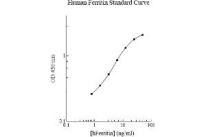Prepare all reagents, working standards and samples as instructed. Bring all reagents to room temperature before use. The assay is performed at room temperature (20 - 30 °C). Remove excess microplate strips from the plate frame and return them immediately to the foil pouch with desiccant inside. Reseal the pouch securely to minimize exposure to water vapor and store in a vacuum desiccator. Add 50 µL of Standard or sample per well. Cover wells with a sealing tape and incubate for two hours. Start the timer after the last sample addition. Wash five times with 200 µL of Wash Buffer manually. Invert the plate each time and decant the contents, hit it 4-5 times on absorbent paper towel to completely remove the liquid. If using a machine wash six times with 300 µL of Wash Buffer and then invert the plate, decant the contents, hit it 4-5 times on absorbent paper towel to completely remove the liquid. Add 50 µL of Biotinylated Ferritin Antibody to each well and incubate for one hour. Wash a microplate as described above. Add 50 µL of Streptavidin-Peroxidase Conjugate per well and incubate for 30 minutes. Turn on the microplate reader and set up the program in advance. Wash a microplate as described above. Add 50 µL of Chromogen Substrate per well and incubate for about 10 minutes or till the optimal color density develops. Gently tap the plate to ensure thorough mixing and break the bubbles in the well with pipette tip. Add 50 µL of Stop Solution to each well. The color will change from blue to yellow. Read the absorbance on a microplate reader at a wavelength of 450 nm immediately. If wavelength correction is available, subtract readings at 570 nm from those at 450 nm to correct optical imperfections. Otherwise, read the plate at 450 nm only. Please note that some unstable black particles may be generated at high concentration points after stopping the reaction for about 10 minutes, which will reduce the readings.
