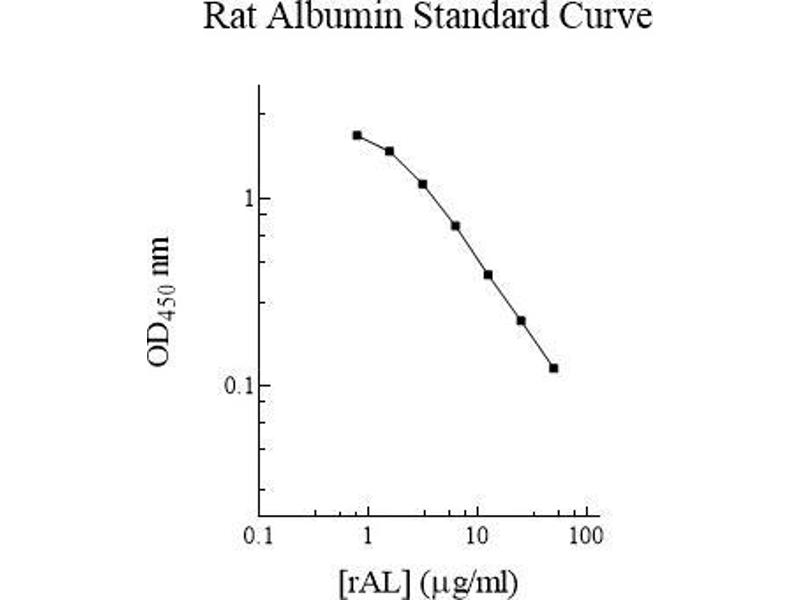 - Rat Albumin Microplate: A 96-well polystyrene microplate (12 strips of 8 wells) coated with a polyclonal antibody against rat albumin. Sealing Tapes: Each kit contains 3 pre-cut, pressure-sensitive sealing tapes that can be cut to fit the format of the individual assay. 1 Rat Albumin Standard: Rat albumin in a buffered protein base (150 µg, lyophilized). Biotinylated Albumin: 1 vial, lyophilized. MIx Diluent Concentrate (10x): A 10-fold concentrated buffered protein base (30 ml). Wash Buffer Concentrate (20x): A 20-fold concentrated buffered surfactant (30 ml). Streptavidin-Peroxidase Conjugate (SP Conjugate): A 100-fold concentrate (80µl). Chromogen Substrate: A ready-to-use stabilized peroxidase chromogen substrate tetramethylbenzidine (8 ml). Stop Solution: A 0.5 N hydrochloric acid to stop the chromogen substrate reaction (12 ml).