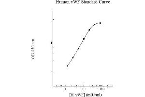 Prepare all reagents, working standards and samples as instructed. Bring all reagents to room temperature before use. The assay is performed at room temperature (20 - 30 °C). Remove excess microplate strips from the plate frame and return them immediately to the foil pouch with desiccant inside. Reseal the pouch securely to minimize exposure to water vapor and store in a vacuum desiccator. Add 50 µL of standard or sample per well, and cover wells and incubate for two hours. Start the timer after the last sample addition. Wash five times with 200 µL of Wash Buffer manually. Invert the plate each time and decant the contents, hit it 4-5 times on absorbent paper towel to completely remove the liquid. If using a machine wash six times with 300 µL of Wash Buffer and then invert the plate, decant the contents, hit it 4-5 times on absorbent paper towel to completely remove the liquid. Add 50 µL of Biotinylated VWF Antibody to each well and incubate for two hours. Wash a microplate as described above. Add 50 µL of Streptavidin-Peroxidase Conjugate to each well and incubate for 30 minutes. Turn on the microplate reader and set up the program in advance. Wash a microplate as described above. Add 50 µL of Chromogen Substrate per well and incubate for about 15 minutes or until the optimal blue color density develops. Gently tap plate to ensure thorough mixing and break the bubbles in the well with pipette tip. Add 50 µL of Stop Solution to each well. The color will change from blue to yellow. 3 Read the absorbance on a microplate reader at a wavelength of 450 nm immediately. If wavelength correction is available, subtract readings at 570 nm from those at 450 nm to correct optical imperfections. Otherwise, read the plate at 450 nm only. Please note that some unstable black particles may be generated at high concentration points after stopping the reaction for about 10 minutes, which will reduce the readings.