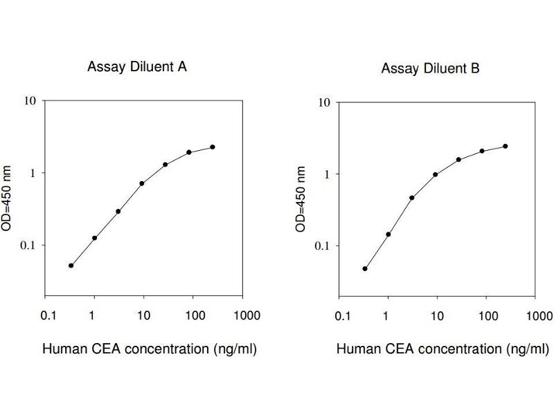 Typical Data: These standard curves are for demonstration only. A standard curve must be run with each assay. Assay Diluent A Human CEA concentration (ng/mL) O D =4 50 n m 0.1 1 10 0.1 1 10 100 1000 Assay Diluent B Human CEA concentration (ng/mL) O D =4 50 n m 0.1 1 10 0.1 1 10 100 1000