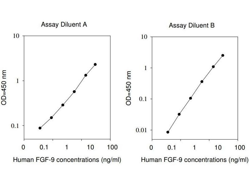 Typical Data: These standard curves are for demonstration only. A standard curve must be run with each assay. Assay Diluent A Human FGF-9 concentrations (ng/mL) O D =4 50 n m 0.1 1 10 0 0.1 1 10 100 Assay Diluent B Human FGF-9 concentrations (ng/mL) O D =4 50 n m 0.01 0.1 1 10 0 0.1 1 10 100