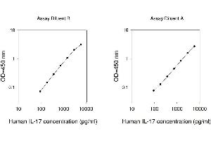 Typical Data: These standard curves are for demonstration only. A standard curve must be run with each assay. Human IL-17 concentration (pg/mL) 10 100 1000 10000 O D =4 50 n m 0.1 1 10 Assay Diluent B Human IL-17 concentration (pg/mL) 10 100 1000 10000 O D =4 50 n m 0.1 1 10 Assay Diluent A