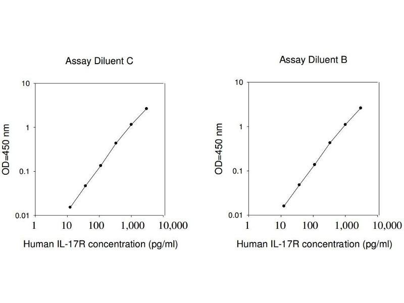 1. Bring all reagents and samples to room temperature (18 - 25°C) before use. 2. Sample dilution: Assay Diluent C (Item L) is used for dilution of serum/plasma samples, 1x Assay Diluent B (Item E) can be used for dilution of cell culture supernates/urine. 3. Assay Diluent B should be diluted 5-fold with deionized or distilled water before use. 4. Preparation of standard: Briefly spin the vial of Item C and then add 400 µl Assay Diluent C (for serum/plasma samples) or 1x Assay Diluent B (for cell culture supernates/urine) into Item C vial to prepare a 50 ng/ml standard. Dissolve the powder thoroughly by a gentle mix. Add 30 µl IL-17R standard (50 ng/ml) from the vial of Item C, into a tube with 470 µl Assay Diluent C or 1x Assay Diluent B to prepare a 3,000 pg/ml standard solution. Pipette 400 µl Assay Diluent C or 1x Assay Diluent B into each tube. Use the 3,000 pg/ml standard solution to produce a dilution series (shown below). Mix each tube thoroughly before the next transfer. Gently vortex to mix. Assay Diluent C or 1x Assay Diluent B serves as the zero standard (0 pg/ml). 5. If the Wash Concentrate (20x) (Item B) contains visible crystals, warm to room temperature and mix gently until dissolved. Dilute 20 ml of Wash Buffer Concentrate into deionized or distilled water to yield 400 ml of 1x Wash Buffer. 6. Briefly spin the Detection Antibody vial (Item F) before use. Add 100 µl of 1x Assay Diluent B into the vial to prepare a detection antibody concentrate. Pipette up and down to mix gently (the concentrate can be stored at 4°C for 5 days). The detection antibody concentrate should be diluted 80-fold with 1x Assay Diluent B and used in step 4 of Part VI Assay Procedure. 7. Briefly spin the HRP-Streptavidin concentrate vial (Item G) and pipette up and down to mix gently before use. HRP-Streptavidin concentrate should be diluted 10,000-fold with 1x Assay Diluent B. For example: Briefly spin the vial (Item G) and pipette up and down to mix gently . Add 2 µl of HRP-Streptavidin concentrate into a tube with 198 µl 1x Assay Diluent B to prepare a 100-fold diluted HRP- Streptavidin solution (do not store the diluted solution for next day use). Mix through and then pipette 100 µl of prepared 100-fold diluted solution into a tube with 10 ml 1x Assay Diluent B to prepare a final 10,000 fold diluted HRP-Streptavidin solution.