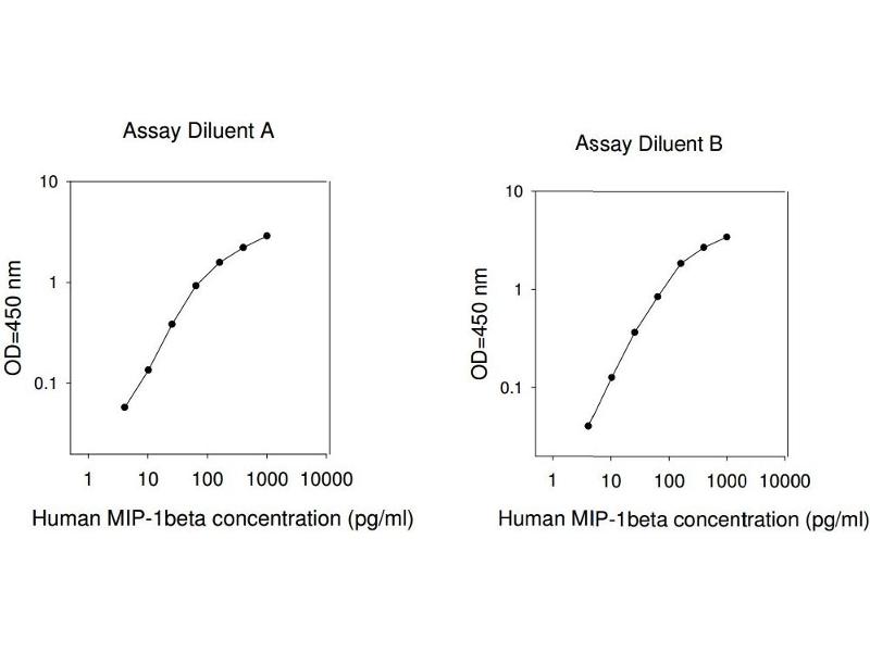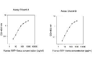 Typical Data: These standard curves are for demonstration only. A standard curve must be run with each assay. Assay Diluent A Human MIP-1beta concentration (pg/mL) 1 10 100 1000 10000 O D =4 50 n m 0.1 1 10 Assay Diluent B Human MIP-1beta concentration (pg/mL) 1 10 100 1000 10000 O D =4 50 n m 0.1 1 10