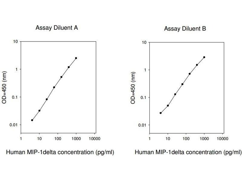 - MIP-1delta is a secretory protein. It was isolated originaly from a human fetal spleen cDNA library. Human MIP-1delta shows the highest homology with human HCC-1, Chemokine-beta-8, murine C10 , and CCF18 . Human MIP-1delta is expressed in T-cells and B-lymphocytes, NK-cells, monocytes, and monocyte-derived dendritic cells. It is not expressed in bone marrow-derived dendritic cells. In monocytes and dendritic cells the expression of MIP-1delta can be induced by other pro-inflammatory cytokines . Human MIP-1delta is chemotactic for T-cells and monocytes. It has no chemotactic activity for neutrophils, eosinophils, or B-cells. The Human MIP-1delta ELISA (Enzyme-Linked Immunosorbent Assay) kit is an in vitro enzyme-linked immunosorbent assay for the quantitative measurement of human MIP-1delta in serum, plasma, cell culture supernatants and urine. This assay employs an antibody specific for human MIP-1delta coated on a 96-well plate. Standards and samples are pipetted into the wells and MIP-1delta present in a sample is bound to the wells by the immobilized antibody. The wells are washed and biotinylated anti-human MIP-1delta antibody is added. After washing away unbound biotinylated antibody, HRP-conjugated streptavidin is pipetted to the wells. The wells are again washed, a TMB substrate solution is added to the wells and color develops in proportion to the amount of MIP-1delta bound. The Stop Solution changes the color from blue to yellow, and the intensity of the color is measured at 450 nm. Reproducibility: Intra-Assay: CV<10% Inter-Assay: CV<12%.