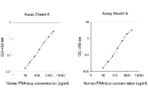Typical Data: These standard curves are for demonstration only. A standard curve must be run with each assay. Assay Diluent A Human PSA-total concentration (pg/mL) 1 10 100 1000 10000 O D =4 50 n m 0.01 0.1 1 10 Assay Diluent B Human PSA-total concentration (pg/mL) 1 10 100 1000 10000 O D =4 50 n m 0.01 0.1 1 10