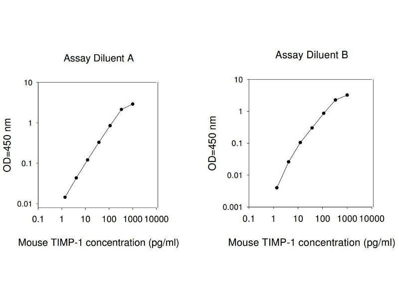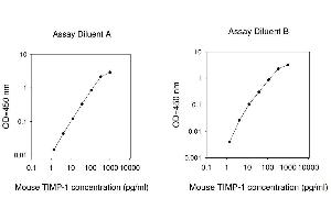 Typical Data: These standard curves are for demonstration only. A standard curve must be run with each assay. Assay Diluent A Mouse TIMP-1 concentration (pg/mL) 0.1 1 10 100 1000 10000 O D =4 50 n m 0.01 0.1 1 10 Assay Diluent B Mouse TIMP-1 concentration (pg/mL) 0.1 1 10 100 1000 10000 O D =4 50 n m 0.001 0.01 0.1 1 10