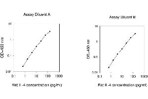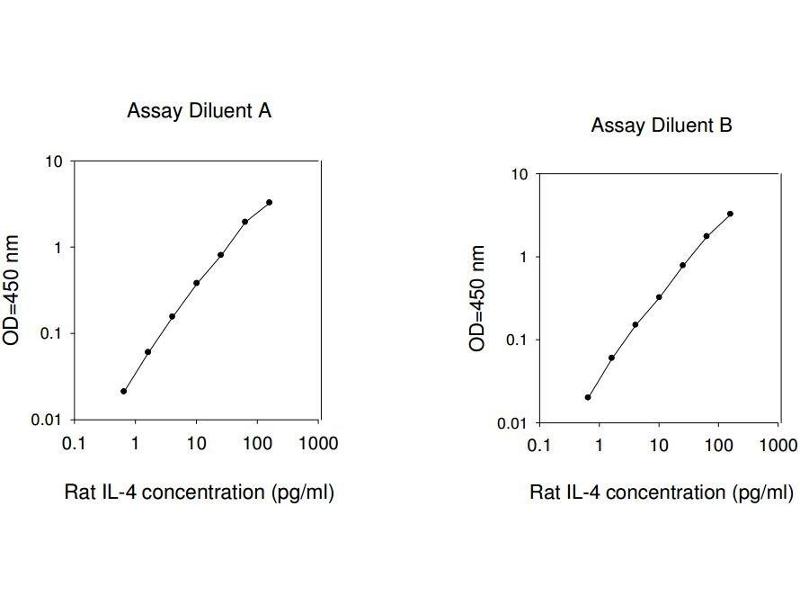 Typical Data: These standard curves are for demonstration only. A standard curve must be run with each assay. Assay Diluent A Rat IL-4 concentration (pg/mL) 0.1 1 10 100 1000 O D =4 50 n m 0.01 0.1 1 10 Assay Diluent B Rat IL-4 concentration (pg/mL) 0.1 1 10 100 1000 O D =4 50 n m 0.01 0.1 1 10