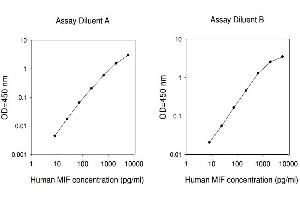 Typical Data: These standard curves are for demonstration only. A standard curve must be run with each assay. Assay Diluent A Human MIF concentration (pg/mL) 1 10 100 1000 10000 O D =4 50 n m 0.001 0.01 0.1 1 10 Assay Diluent B Human MIF concentration (pg/mL) 1 10 100 1000 10000 O D =4 50 n m 0.01 0.1 1 10