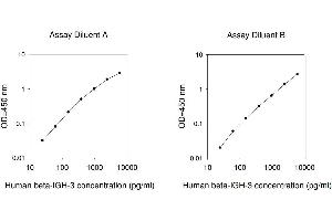 Typical Data: These standard curves are for demonstration only. A standard curve must be run with each assay. Assay Diluent A Human beta-IGH-3 concentration (pg/mL) 10 100 1000 10000 O D =4 50 n m 0.01 0.1 1 10 Assay Diluent B Human beta-IGH-3 concentration (pg/mL) 10 100 1000 10000 O D =4 50 n m 0.01 0.1 1 10