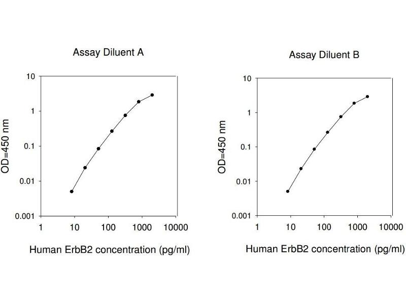 Typical Data: These standard curves are for demonstration only. A standard curve must be run with each assay. Assay Diluent B Human ErbB2 concentration (pg/mL) 1 10 100 1000 10000 O D =4 50 n m 0.001 0.01 0.1 1 10 Assay Diluent A Human ErbB2 concentration (pg/mL) 1 10 100 1000 10000 O D =4 50 n m 0.001 0.01 0.1 1 10