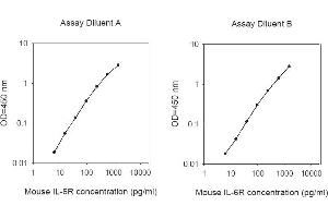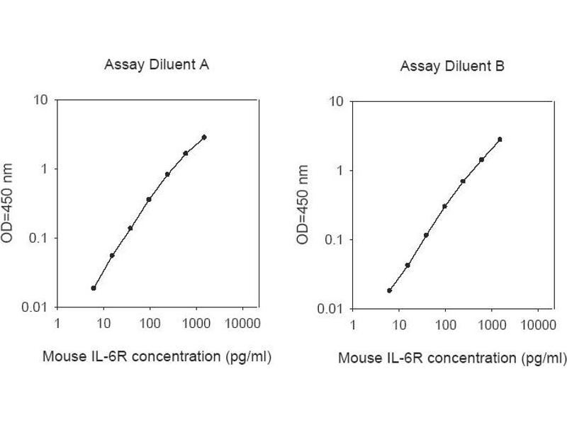 Typical Data: These standard curves are for demonstration only. A standard curve must be run with each assay. Assay Diluent A Mouse IL-6R concentration (pg/mL) 1 10 100 1000 10000 O D =4 50 n m 0.01 0.1 1 10 Assay Diluent B Mouse IL-6R concentration (pg/mL) 1 10 100 1000 10000 O D =4 50 n m 0.01 0.1 1 10