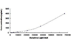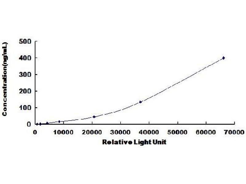 In order to make the calculation easier, we plot the RLU value of the standard (X-axis) against the known concentration of the standard (Y-axis), although concentration is indeed the independent variable while RLU value is the dependent variable. Further, in this part, in order to help the customer perform the assay more visual, we provide the customer with the raw data (not the log of data). However, plotting log of the data to construct the curve will be recommended. The RLU values of the standard curve may vary according to the conditions of assay performance (e.g. operator, pipetting technique, washing technique or temperature effects). This curve is provided for demonstration only. The customers should establish their own standard curve for each test conducted. -