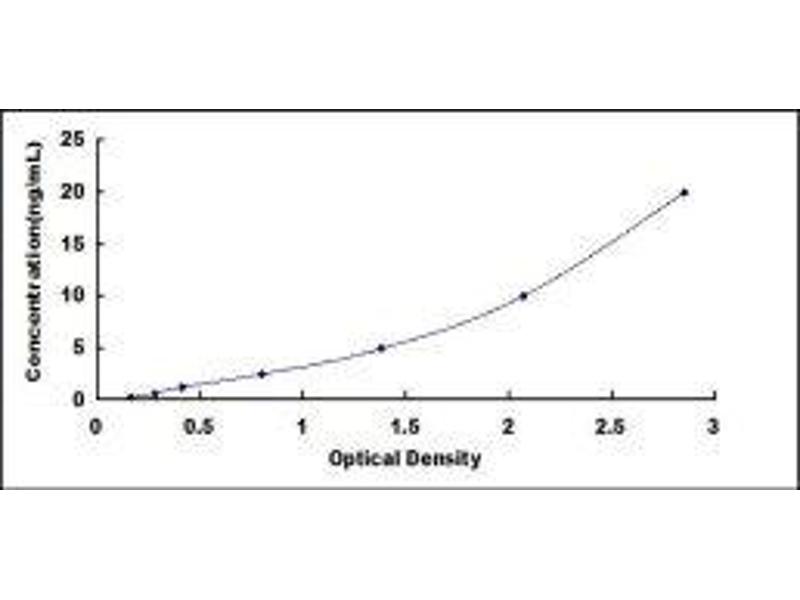 2. Standard - Reconstitute the Standard with 1.0 mL of Standard Diluent, keep for 10 minutes at room temperature, shake gently (not to foam). The concentration of the standard in the stock solution is 200 ng/mL. Firstly dilute the stock solution to 20 ng/mL and the diluted standard serves as the highest standard (20 ng/mL). Then prepare 7 tubes containing 0.5 mL Standard Diluent and use the diluted standard to produce a double dilution series. Mix each tube thoroughly before the next transfer. Set up 7 points of diluted standard such as 20 ng/mL, 10 ng/mL, 5 ng/mL, 2.5 ng/mL, 1.25 ng/mL, 0.625 ng/mL, 0.312 ng/mL, and the last microcentrifuge tube with Standard Diluent is the blank as 0 ng/mL.