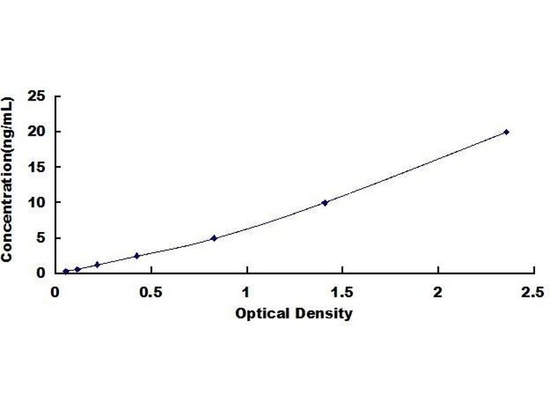 2. Standard - Reconstitute the Standard with 1.0 mL of Standard Diluent, keep for 10 minutes at room temperature, shake gently (not to foam). The concentration of the standard in the stock solution is 20 ng/mL. Prepare 7 tubes containing 0.5 mL Standard Diluent and produce a double dilution series. Mix each tube thoroughly before the next transfer. Set up 7 points of diluted standard such as 20 ng/mL, 10 ng/mL, 5 ng/mL, 2.5 ng/mL, 1.25 ng/mL, 0.625 ng/mL, 0.312 ng/mL, and the last microcentrifuge tube with Standard Diluent is the blank as 0 ng/mL.