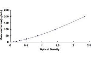 In order to make the calculation easier, we plot the O.D. value of the standard (X-axis) against the log of concentration of the standard (Y-axis), although concentration is the independent variable and O.D. value is the dependent variable. The O.D. values of the standard curve may vary according to the conditions of assay performance (e.g. operator, pipetting technique, washing technique or temperature effects). Typical standard curve below is provided for reference only. -