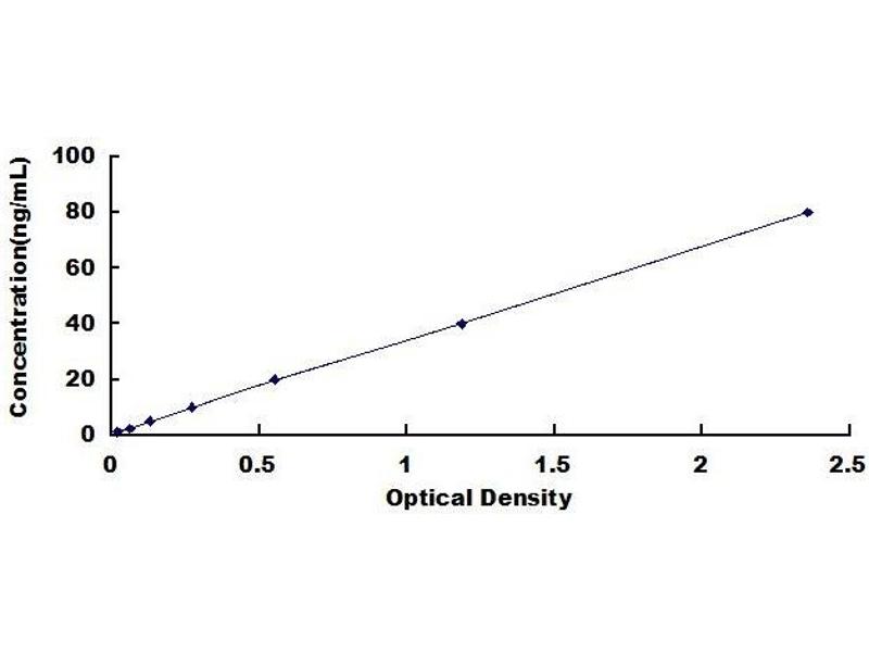 2. Standard - Reconstitute the Standard with 1.0 mL of Standard Diluent, keep for 10 minutes at room temperature, shake gently (not to foam). The concentration of the standard in the stock solution is 80 ng/mL. Prepare 7 tubes containing 0.5 mL Standard Diluent and produce a double dilution series. Mix each tube thoroughly before the next transfer. Set up 7 points of diluted standard such as 80 ng/mL, 40 ng/mL, 20 ng/mL, 10 ng/mL, 5 ng/mL, 2.5 ng/mL, 1.25 ng/mL, and the last microcentrifuge tube with Standard Diluent is the blank as 0 ng/mL.