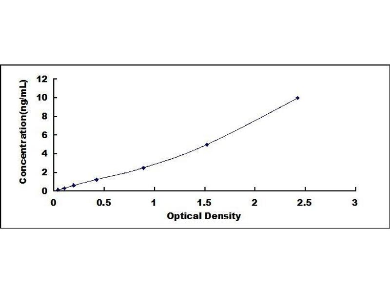 2. Standard - Reconstitute the Standard with 1.0 mL of Standard Diluent, keep for 10 minutes at room temperature, shake gently (not to foam). The concentration of the standard in the stock solution is 40 ng/mL. Firstly dilute the stock solution to 10 ng/mL and the diluted standard serves as the highest standard (10 ng/mL). Then prepare 7 tubes containing 0.5 mL Standard Diluent and use the diluted standard to produce a double dilution series. Mix each tube thoroughly before the next transfer. Set up 7 points of diluted standard such as 10 ng/mL, 5 ng/mL, 2.5 ng/mL, 1.25 ng/mL, 0.625 ng/mL, 0.312 ng/mL, 0.156 ng/mL, and the last microcentrifuge tube with Standard Diluent is the blank as 0 ng/mL.