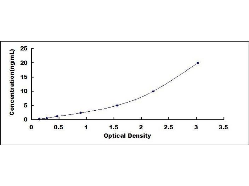 2. Standard - Reconstitute the Standard with 1.0 mL of Standard Diluent, keep for 10 minutes at room temperature, shake gently (not to foam). The concentration of the standard in the stock solution is 20 ng/mL. Prepare 7 tubes containing 0.5 mL Standard Diluent and produce a double dilution series. Mix each tube thoroughly before the next transfer. Set up 7 points of diluted standard such as 20 ng/mL, 10 ng/mL, 5 ng/mL, 2.5 ng/mL, 1.25 ng/mL, 0.625 ng/mL, 0.312 ng/mL, and the last microcentrifuge tube with Standard Diluent is the blank as 0 ng/mL.