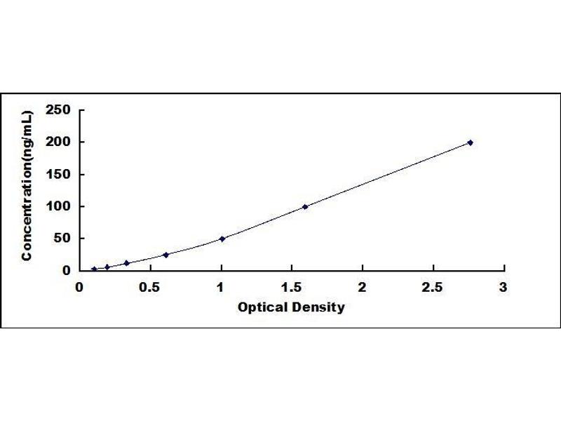 In order to make the calculation easier, we plot the O.D. value of the standard (X-axis) against the log of concentration of the standard (Y-axis), although concentration is the independent variable and O.D. value is the dependent variable. The O.D. values of the standard curve may vary according to the conditions of assay performance (e.g. operator, pipetting technique, washing technique or temperature effects). Typical standard curve below is provided for reference only. -