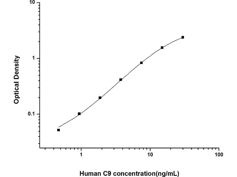 Intra-assay Precision (Precision within an assay): 3 samples with low, mid range and high level Human C9 were tested 20 times on one plate, respectively. Inter-assay Precision (Precision between assays): 3 samples with low, mid range and high level Human C9 were tested on 3 different plates, 20 replicates in each plate. Both intra-CV and inter-CV are < 10 %.