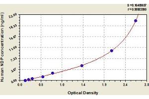 - This assay has high sensitivity and excellent specificity for detection of human NDP. No significant cross-reactivity or interference between human NDP and analogues was observed. Note: Limited by current skills and knowledge, it is impossible for us to complete the cross-reactivity detection between human NDP and all the analogues, therefore, cross reaction may still exist.