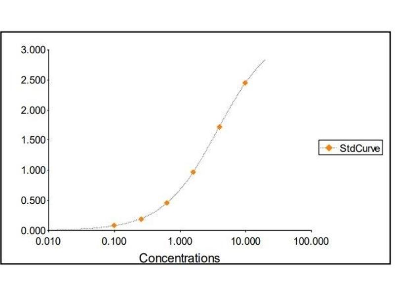 All samples and standards should be assayed in duplicates. 2. The Standards and the test sample(s) should be loaded into the ELISA wells as quickly as possible to avoid a shift in OD readings. Using a multichannel pipette would reduce this occurrence. Pipette 100 μL of Standard 0 (0.0 ng/mL) in duplicate Standard 1 (0.10 ng/mL) in duplicate Standard 2 (0.26 ng/mL) in duplicate Standard 3 (0.64 ng/mL) in duplicate Standard 4 (1.60 ng/mL) in duplicate Standard 5 (4 ng/mL) in duplicate Standard 6 (10 ng/mL) in duplicate 3. Pipette 100 μL of sample (in duplicate) into pre designated wells. 4. Incubate the micro titer plate while shaking on a microplate shaker at 400rpm at room temperature for one hundred and twenty (120 ± 2) minutes. Keep plate covered and level during incubation. 5. Following incubation, aspirate the contents of the wells. 6. Completely fill each well with appropriately diluted Wash Solution and aspirate. Repeat three times, for a total of four washes. If washing manually: completely fill wells with wash buffer, invert the plate then pour/shake out the contents in a waste container. Follow this by sharply striking the wells on absorbent paper to remove residual buffer. Repeat 3 times for a total of four washes. 7. Pipette 100 μL of appropriately diluted Detection Antibody to each well. Incubate while shaking on a microplate shaker at 400rpm at room temperature for twenty (20 ± 2) minutes. Keep plate covered in the dark and level during incubation. 8. Wash and blot the wells as described in Steps 5/6. 9. Pipette 100 μL of appropriately diluted HRP-streptavidin to each well. Incubate while shaking on a microplate shaker at 400rpm at room temperature for twenty (20 ± 2) minutes. Keep plate covered in the dark and level during incubation. 10. Wash and blot the wells as described in Steps 5/6. 11. Pipette 100 μL of TMB Substrate Solution into each well. 12. Incubate in the dark while shaking on a microplate shaker at 400rpm at room temperature for precisely ten (10) minutes. 13. After ten minutes, add 100 μL of Stop Solution to each well. 14. Determine the absorbance (450 nm) of the contents of each well within 30 minutes. Calibrate the plate reader to manufacturer’s specifications.