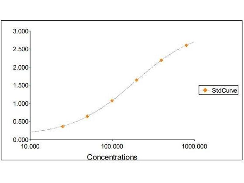 2. The Standards and the test sample(s) should be loaded into the ELISA wells as quickly as possible to avoid a shift in OD readings. Using a multichannel pipette would reduce this occurrence. Pipette 100 μL of Standard 0 (0.0 ng/mL) in duplicate Standard 1 (25 ng/mL) in duplicate Standard 2 (50 ng/mL) in duplicate Standard 3 (100 ng/mL) in duplicate Standard 4 (200 ng/mL) in duplicate Standard 5 (400 ng/mL) in duplicate Standard 6 (800 ng/mL) in duplicate