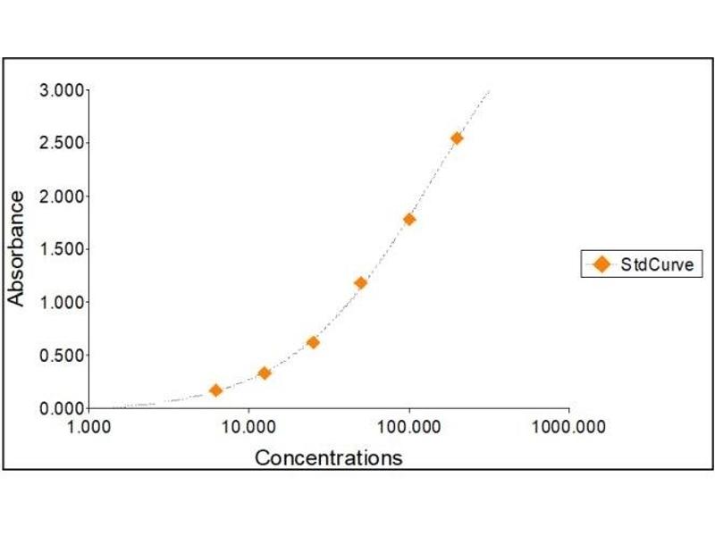 2. The Standards and the test sample(s) should be loaded into the ELISA wells as quickly as possible to avoid a shift in OD readings. Using a multichannel pipette would reduce this occurrence. Pipette 100 μL of Standard 0 (0.0 ng/mL) in duplicate Standard 1 (6.25 ng/mL) in duplicate Standard 2 (12.50 ng/mL) in duplicate Standard 3 (25 ng/mL) in duplicate Standard 4 (50 ng/mL) in duplicate Standard 5 (100 ng/mL) in duplicate Standard 6 (200 ng/mL) in duplicate