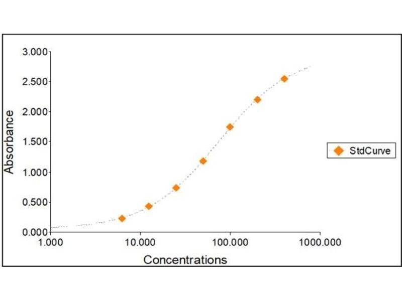 2. The Standards and the test sample(s) should be loaded into the ELISA wells as quickly as possible to avoid a shift in OD readings. Using a multichannel pipette would reduce this occurrence. Pipette 100 μL of Standard 0 (0.0 ng/mL) in duplicate Standard 1 (6.25 ng/mL) in duplicate Standard 2 (12.50 ng/mL) in duplicate Standard 3 (25 ng/mL) in duplicate Standard 4 (50 ng/mL) in duplicate Standard 5 (100 ng/mL) in duplicate Standard 6 (200 ng/mL) in duplicate Standard 7 (400 ng/mL) in duplicate