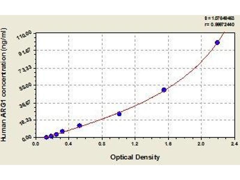 This assay employs the quantitative sandwich enzyme immunoassay technique. Antibody specific for ARG1 has been pre-coated onto a microplate. Standards and samples are pipetted into the wells and any ARG1 present is bound by the immobilized antibody. After removing any unbound substances, a biotin-conjugated antibody specific for ARG1 is added to the wells. After washing, avidin conjugated Horseradish Peroxidase (HRP) is added to the wells. Following a wash to remove any unbound avidin-enzyme reagent, a substrate solution is added to the wells and color develops in proportion to the amount of ARG1 bound in the initial step. The color development is stopped and the intensity of the color is measured.