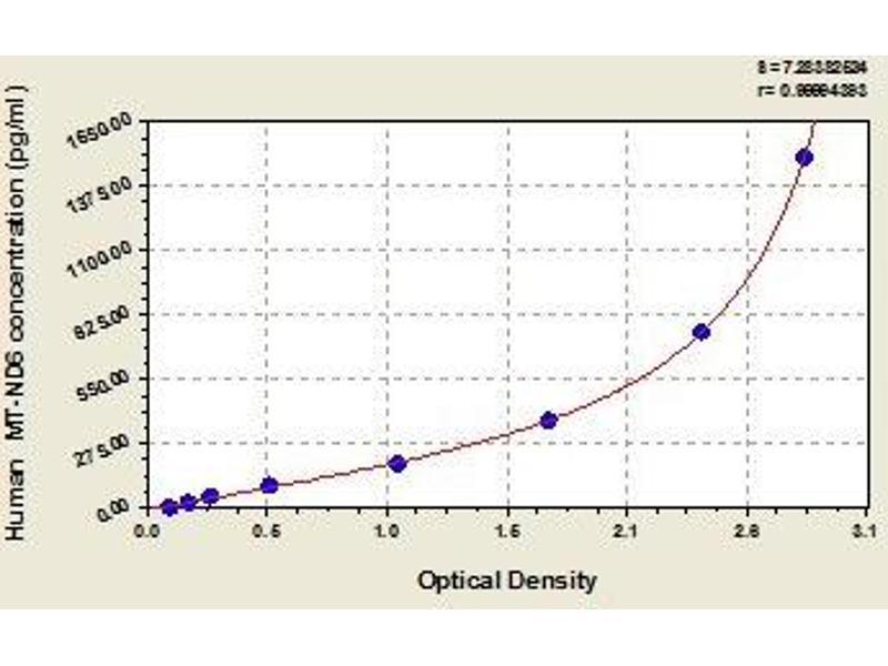 - Antibody specific for MT-ND6 has been pre-coated onto a microplate. Standards and samples are pipetted into the wells and any MT-ND6 present is bound by the immobilized antibody. After removing any unbound substances, a biotin-conjugated antibody specific for MT-ND6 is added to the wells. After washing, avidin conjugated Horseradish Peroxidase (HRP) is added to the wells. Following a wash to remove any unbound avidin-enzyme reagent, a substrate solution is added to the wells and color develops in proportion to the amount of MT-ND6 bound in the initial step. The color development is stopped and the intensity of the color is measured.