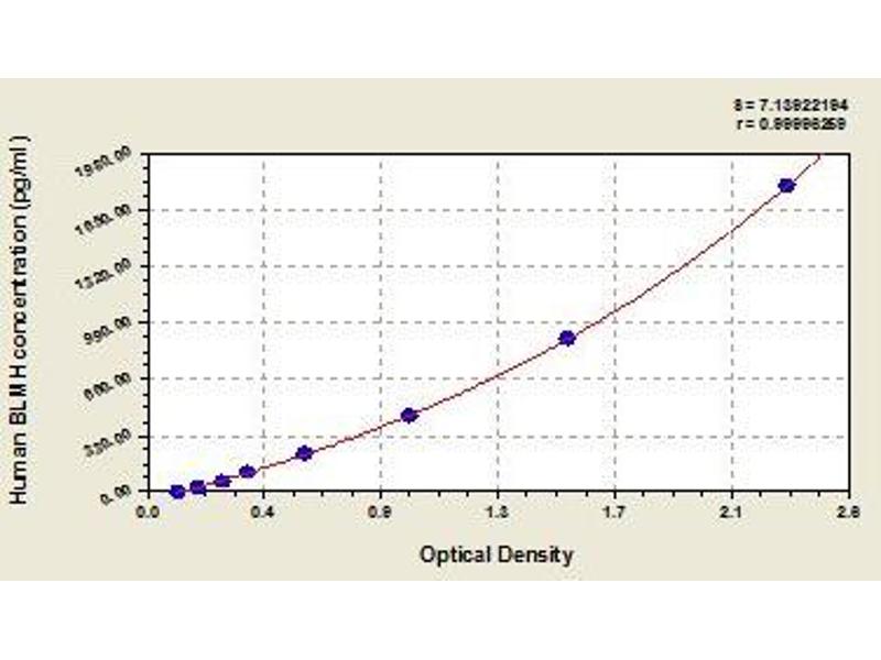 - Antibody specific for BLMH has been pre-coated onto a microplate. Standards and samples are pipetted into the wells and any BLMH present is bound by the immobilized antibody. After removing any unbound substances, a biotin-conjugated antibody specific for BLMH is added to the wells. After washing, avidin conjugated Horseradish Peroxidase (HRP) is added to the wells. Following a wash to remove any unbound avidin-enzyme reagent, a substrate solution is added to the wells and color develops in proportion to the amount of BLMH bound in the initial step. The color development is stopped and the intensity of the color is measured.