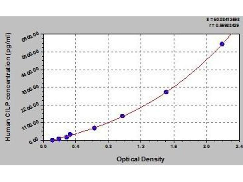 - Antibody specific for CILP has been pre-coated onto a microplate. Standards and samples are pipetted into the wells and any CILP present is bound by the immobilized antibody. After removing any unbound substances, a biotin-conjugated antibody specific for CILP is added to the wells. After washing, avidin conjugated Horseradish Peroxidase (HRP) is added to the wells. Following a wash to remove any unbound avidin-enzyme reagent, a substrate solution is added to the wells and color develops in proportion to the amount of CILP bound in the initial step. The color development is stopped and the intensity of the color is measured.