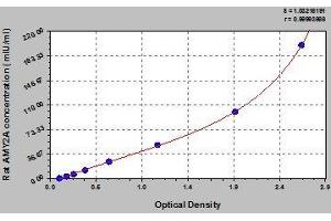 - Antibody specific for AMY2A has been pre-coated onto a microplate. Standards and samples are pipetted into the wells and any AMY2A present is bound by the immobilized antibody. After removing any unbound substances, a biotin-conjugated antibody specific for AMY2A is added to the wells. After washing, avidin conjugated Horseradish Peroxidase (HRP) is added to the wells. Following a wash to remove any unbound avidin-enzyme reagent, a substrate solution is added to the wells and color develops in proportion to the amount of AMY2A bound in the initial step. The color development is stopped and the intensity of the color is measured.