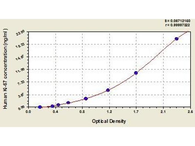 This assay employs the quantitative sandwich enzyme immunoassay technique. Antibody specific for Ki-67 has been pre-coated onto a microplate. Standards and samples are pipetted into the wells and any Ki-67 present is bound by the immobilized antibody. After removing any unbound substances, a biotin-conjugated antibody specific for Ki-67 is added to the wells. After washing, avidin conjugated Horseradish Peroxidase (HRP) is added to the wells. Following a wash to remove any unbound avidin-enzyme reagent, a substrate solution is added to the wells and color develops in proportion to the amount of Ki-67 bound in the initial step. The color development is stopped and the intensity of the color is measured.