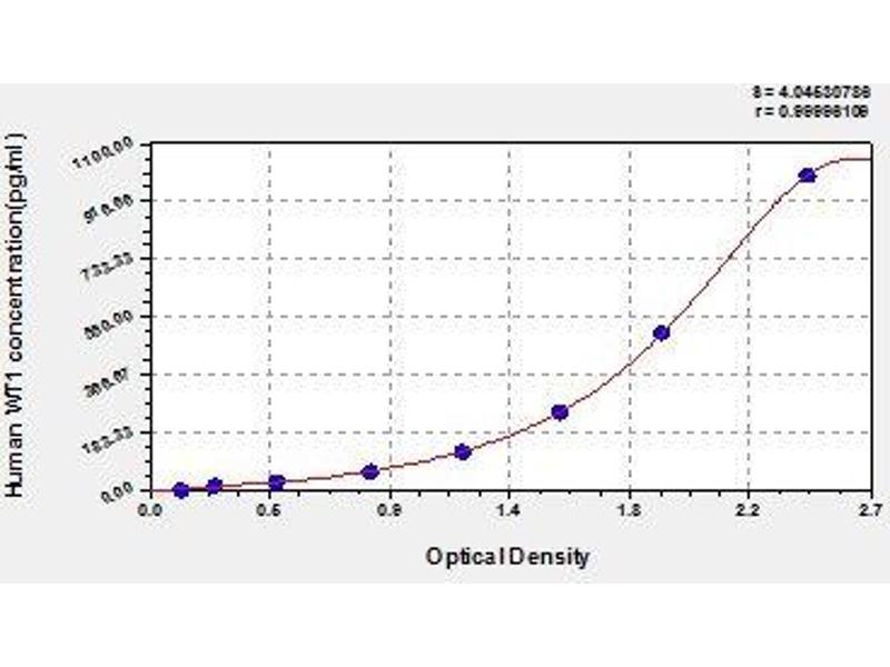 Antibody specific for WT1 has been pre-coated onto a microplate. Standards and samples are pipetted into the wells and any WT1 present is bound by the immobilized antibody. After removing any unbound substances, a biotin-conjugated antibody specific for WT1 is added to the wells. After washing, avidin conjugated Horseradish Peroxidase (HRP) is added to the wells. Following a wash to remove any unbound avidin-enzyme reagent, a substrate solution is added to the wells and color develops in proportion to the amount of WT1 bound in the initial step. The color development is stopped and the intensity of the color is measured.