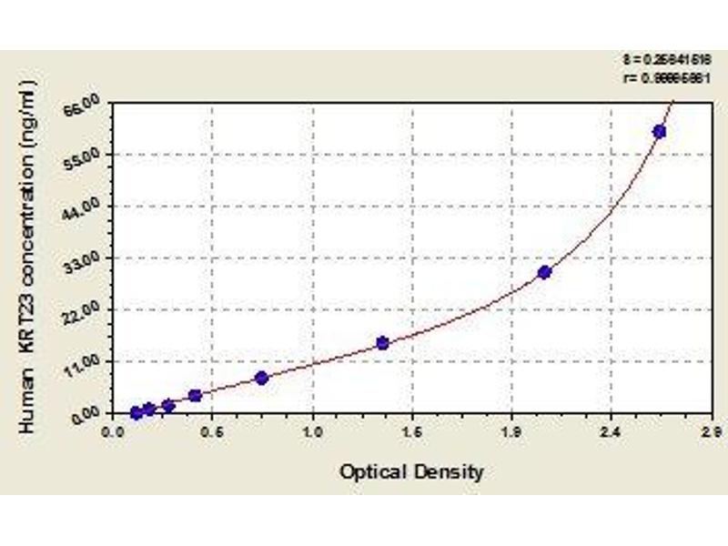 - Antibody specific for KRT23 has been pre-coated onto a microplate. Standards and samples are pipetted into the wells and any KRT23 present is bound by the immobilized antibody. After removing any unbound substances, a biotin-conjugated antibody specific for KRT23 is added to the wells. After washing, avidin conjugated Horseradish Peroxidase (HRP) is added to the wells. Following a wash to remove any unbound avidin-enzyme reagent, a substrate solution is added to the wells and color develops in proportion to the amount of KRT23 bound in the initial step. The color development is stopped and the intensity of the color is measured.