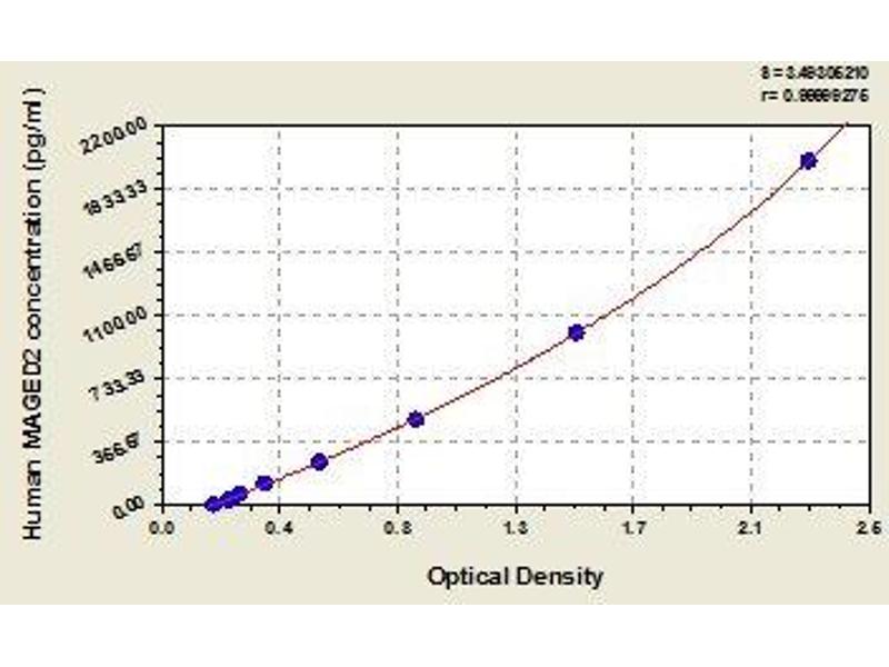 - Antibody specific for MAGED2 has been pre-coated onto a microplate. Standards and samples are pipetted into the wells and any MAGED2 present is bound by the immobilized antibody. After removing any unbound substances, a biotin-conjugated antibody specific for MAGED2 is added to the wells. After washing, avidin conjugated Horseradish Peroxidase (HRP) is added to the wells. Following a wash to remove any unbound avidin-enzyme reagent, a substrate solution is added to the wells and color develops in proportion to the amount of MAGED2 bound in the initial step. The color development is stopped and the intensity of the color is measured.