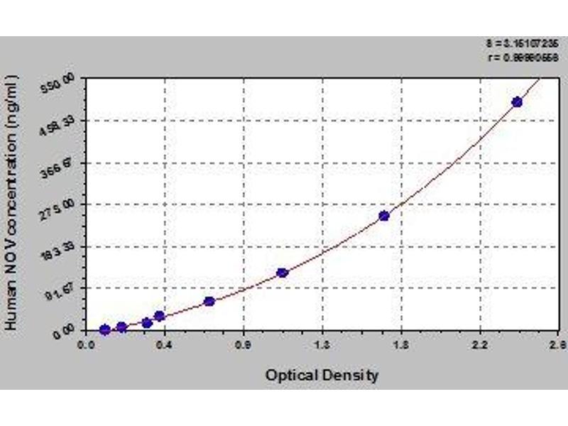 Antibody specific for NOV has been pre-coated onto a microplate. Standards and samples are pipetted into the wells and any NOV present is bound by the immobilized antibody. After removing any unbound substances, a biotin-conjugated antibody specific for NOV is added to the wells. After washing, avidin conjugated Horseradish Peroxidase (HRP) is added to the wells. Following a wash to remove any unbound avidin-enzyme reagent, a substrate solution is added to the wells and color develops in proportion to the amount of NOV bound in the initial step. The color development is stopped and the intensity of the color is measured.