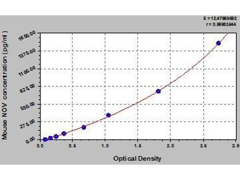 This assay employs the quantitative sandwich enzyme immunoassay technique. Antibody specific for NOV has been pre-coated onto a microplate. Standards and samples are pipetted into the wells and any NOV present is bound by the immobilized antibody. After removing any unbound substances, a biotin-conjugated antibody specific for NOV is added to the wells. After washing, avidin conjugated Horseradish Peroxidase (HRP) is added to the wells. Following a wash to remove any unbound avidin-enzyme reagent, a substrate solution is added to the wells and color develops in proportion to the amount of NOV bound in the initial step. The color development is stopped and the intensity of the color is measured.