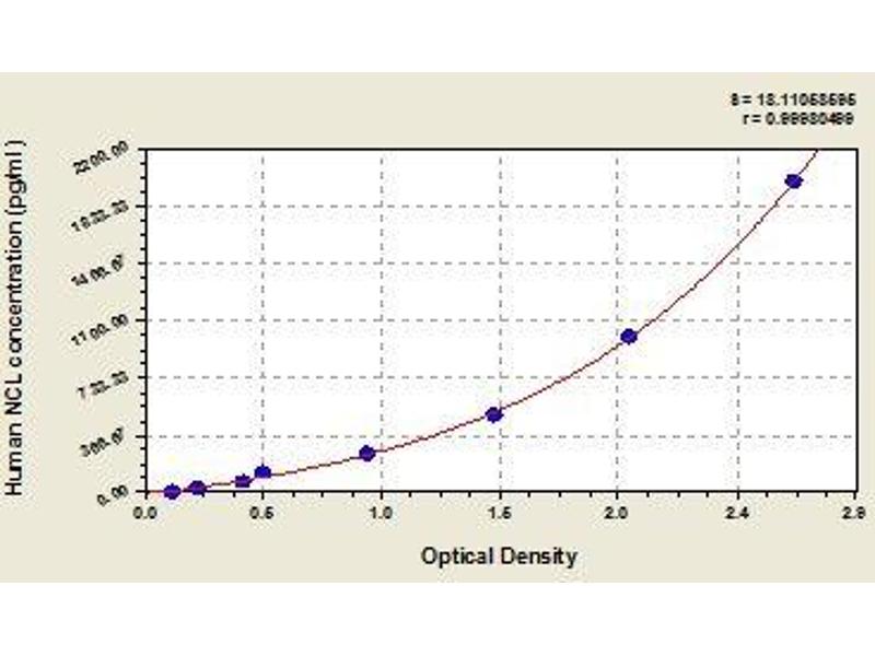 - Antibody specific for NCL has been pre-coated onto a microplate. Standards and samples are pipetted into the wells and any NCL present is bound by the immobilized antibody. After removing any unbound substances, a biotin-conjugated antibody specific for NCL is added to the wells. After washing, avidin conjugated Horseradish Peroxidase (HRP) is added to the wells. Following a wash to remove any unbound avidin-enzyme reagent, a substrate solution is added to the wells and color develops in proportion to the amount of NCL bound in the initial step. The color development is stopped and the intensity of the color is measured.