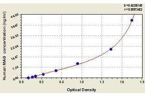 - Antibody specific for MAG has been pre-coated onto a microplate. Standards and samples are pipetted into the wells and any MAG present is bound by the immobilized antibody. After removing any unbound substances, a biotin-conjugated antibody specific for MAG is added to the wells. After washing, avidin conjugated Horseradish Peroxidase (HRP) is added to the wells. Following a wash to remove any unbound avidin-enzyme reagent, a substrate solution is added to the wells and color develops in proportion to the amount of MAG bound in the initial step. The color development is stopped and the intensity of the color is measured.