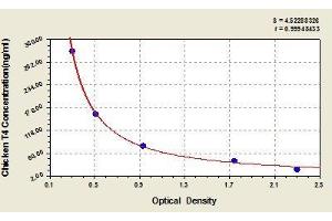 Create a standard curve by reducing the data using computer software capable of generating a four parameter logistic (4-PL) curve fit. As an alternative, construct a standard curve by plotting the mean absorbance for each standard on the x-axis against the concentration on the y-axis and draw a best fit curve through the points on the graph. The data may be linearized by plotting the log of the target antigen concentration versus the log of the O.D. and the best fit line can be determined by regression analysis. This procedure will produce an adequate but less precise fit of the data.