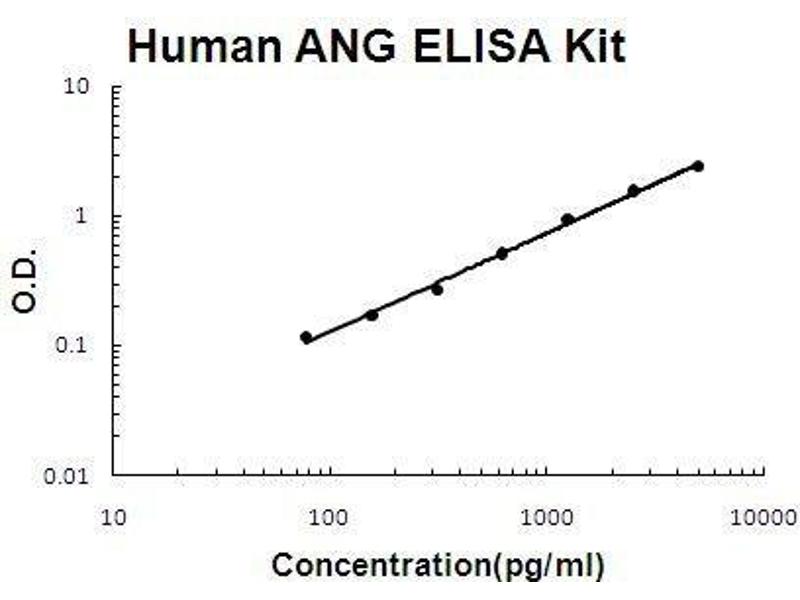 - human ANG ELISA Kit was based on standard sandwich enzyme-linked immune-sorbent assay technology. A monoclonal antibody from mouse specific for ANG has been precoated onto 96-well plates. Standards(E.coli, Q25-P147) and test samples are added to the wells, a biotinylated detection polyclonal antibody from goat specific for ANG is added subsequently and then followed by washing with PBS or TBS buffer. Avidin-Biotin-Peroxidase Complex was added and unbound conjugates were washed away with PBS or TBS buffer. HRP substrate TMB was used to visualize HRP enzymatic reaction. TMB was catalyzed by HRP to produce a blue color product that changed into yellow after adding acidic stop solution. The density of yellow is proportional to the human ANG amount of sample captured in plate.