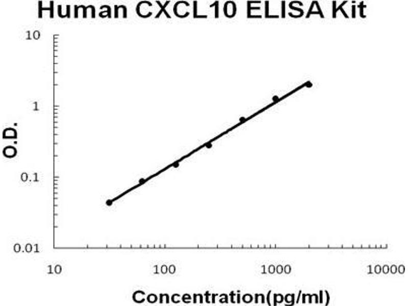 - human CXCL10 ELISA Kit was based on standard sandwich enzyme-linked immune-sorbent assay technology. A monoclonal antibody from mouse specific for CXCL10 has been precoated onto 96-well plates. Standards(E.coli, V22-P98) and test samples are added to the wells, a biotinylated detection polyclonal antibody from goat specific for CXCL10 is added subsequently and then followed by washing with PBS or TBS buffer. Avidin-Biotin-Peroxidase Complex was added and unbound conjugates were washed away with PBS or TBS buffer. HRP substrate TMB was used to visualize HRP enzymatic reaction. TMB was catalyzed by HRP to produce a blue color product that changed into yellow after adding acidic stop solution. The density of yellow is proportional to the human CXCL10 amount of sample captured in plate.