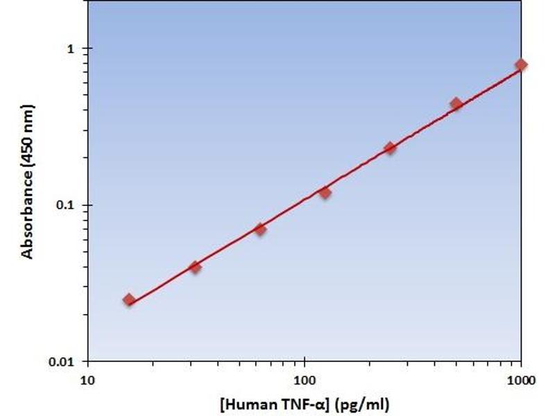 - The OmniKine? Human TNF-? ELISA Kit contains the components necessary for quantitative determination of natural or recombinant Human TNF-? concentrations within any experimental sample including cell lysates, serum and plasma. This particular immunoassay utilizes the quantitative technique of a "Sandwich" Enzyme-Linked Immunosorbent Assay (ELISA) where the target protein (antigen) is bound in a "sandwich" format by the primary capture antibodies coated to each well-bottom and the secondary detection antibodies added subsequently by the investigator. The capture antibodies coated to the bottom of each well are specific for a particular epitope on Human TNF-? while the user-added detection antibodies bind to epitopes on the captured target protein. Amid each step of the procedure, a series of wash steps must be performed to ensure the elimination of non- specific binding between proteins to other proteins or to the solid phase. After incubation and "sandwiching" of the target antigen, a peroxidase enzyme is conjugated to the constant heavy chain of the secondary antibody (either covalently or via Avidin/Streptavidin-Biotin interactions), allowing for a colorimetric reaction to ensue upon substrate addition. When the substrate TMB (3, 3', 5, 5'-Tetramethylbenzidine) is added, the reaction catalyzed by peroxidase yields a blue color that is representative of the antigen concentration. Upon sufficient color development, the reaction can be terminated through addition of Stop Solution (2 N Sulfuric Acid) where the color of the solution will turn yellow. The absorbance of each well can then be read by a spectrophotometer, allowing for generation of a standard curve and subsequent determination of protein concentration.