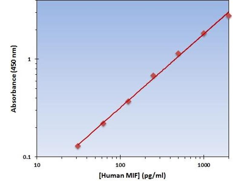- The OmniKine? Human MIF ELISA Kit contains the components necessary for quantitative determination of natural or recombinant Human MIF concentrations within any experimental sample including cell lysates, serum and plasma. This particular immunoassay utilizes the quantitative technique of a "Sandwich" Enzyme-Linked Immunosorbent Assay (ELISA) where the target protein (antigen) is bound in a "sandwich" format by the primary capture antibodies coated to each well-bottom and the secondary detection antibodies added subsequently by the investigator. The capture antibodies coated to the bottom of each well are specific for a particular epitope on Human MIF while the user-added detection antibodies bind to epitopes on the captured target protein. Amid each step of the procedure, a series of wash steps must be performed to ensure the elimination of non- specific binding between proteins to other proteins or to the solid phase. After incubation and "sandwiching" of the target antigen, a peroxidase enzyme is conjugated to the constant heavy chain of the secondary antibody (either covalently or via Avidin/Streptavidin-Biotin interactions), allowing for a colorimetric reaction to ensue upon substrate addition. When the substrate TMB (3, 3', 5, 5'-Tetramethylbenzidine) is added, the reaction catalyzed by peroxidase yields a blue color that is representative of the antigen concentration. Upon sufficient color development, the reaction can be terminated through addition of Stop Solution (2 N Sulfuric Acid) where the color of the solution will turn yellow. The absorbance of each well can then be read by a spectrophotometer, allowing for generation of a standard curve and subsequent determination of protein concentration.